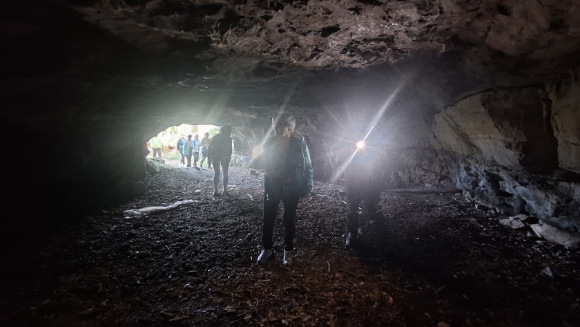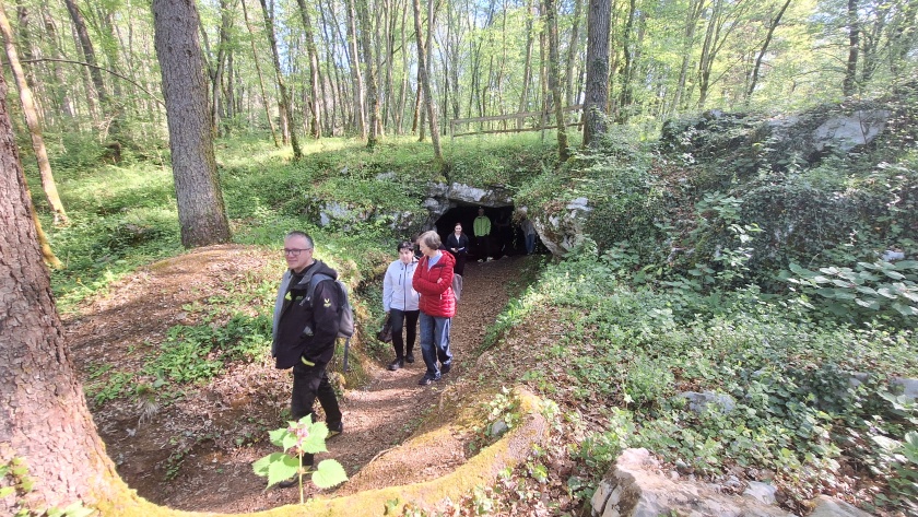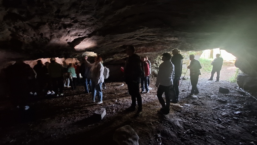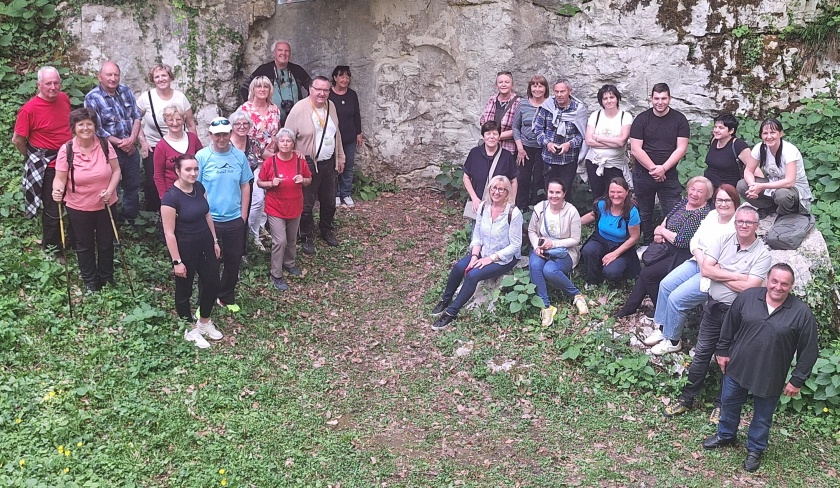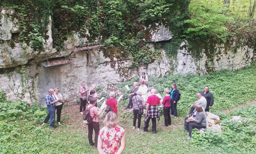 Nato pa smo se podali na spoznavanje belokranjske prazgodovine – od Judovske hiše, jamskega arheološkega najdišča izpred 11.000 let pr. n. št., pa tudi iz kasnejših prazgodovinskih obdobij, do katerega smo se sprehodili ob slikoviti reki Krupi. V Podzemlju oz. na hribu Kučar smo prišli v stik z zapuščino železnih dob in pozne antike, saj so tam odkrili bogate ostanke naselja iz starejše in mlajše železne dobe (od 8. do 1. stoletja pred našim štetjem in zgodnjekrščanski stavbni kompleks iz 5. stoletja našega štetja. Ob tem smo uživali tudi v čudovitem razgledu in od našega vodnika Janka slišali pa pripoved o Velebabi in kako je hrib Kučar sploh nastal >>> Pripovedka o Velebabi. Zadnja arheološka lokacija, ki smo jo obiskali, prav tako v čudovitem naravnem okolju blizu Rožanca, pa je bil Mitrej , v steno opuščenega antičnega kamnoloma ob koncu 2. stoletja vklesana podoba Mitre, perzijskega sončnega boga. Kot izhaja in napisa na obeležju, naj bi se z njim postavite ji , verjetno rimski trgovci ali magistrati (uradniki) priporočili za svoje zdravje in zdravje družinskih članov.
